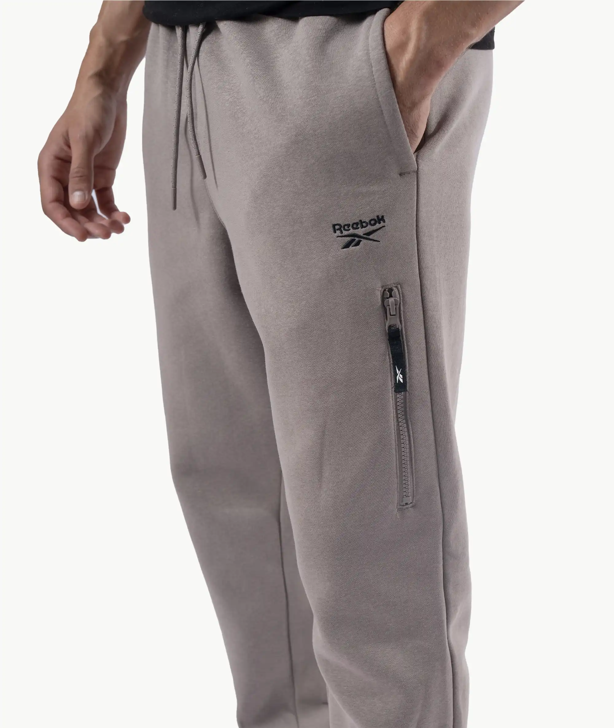 Jogging REEBOK couleur taupe, doux et chaud, parfait pour le sport ou la détente. Taille élastiquée à cordon, poches pratiques dont une zippée.