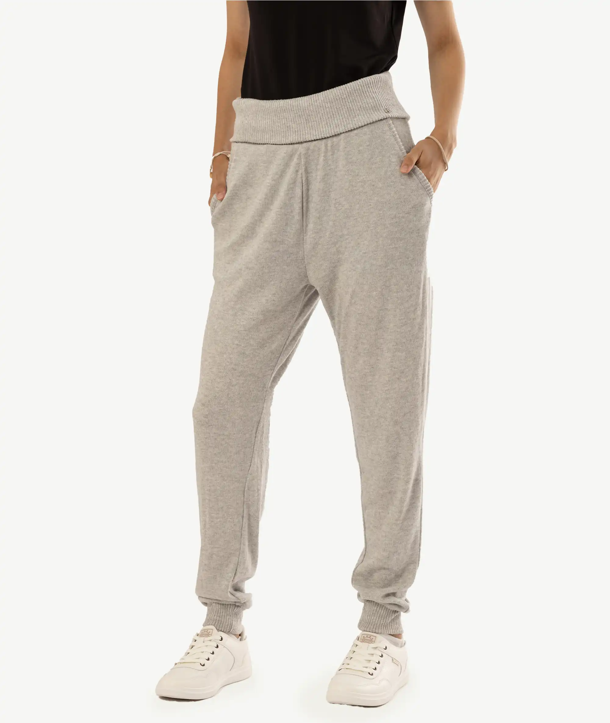 Pantalon d’intérieur gris clair chiné avec ceinture repliable large en maille côtelée. Tissu souple et très doux, poches pratiques et chevilles resserrées.