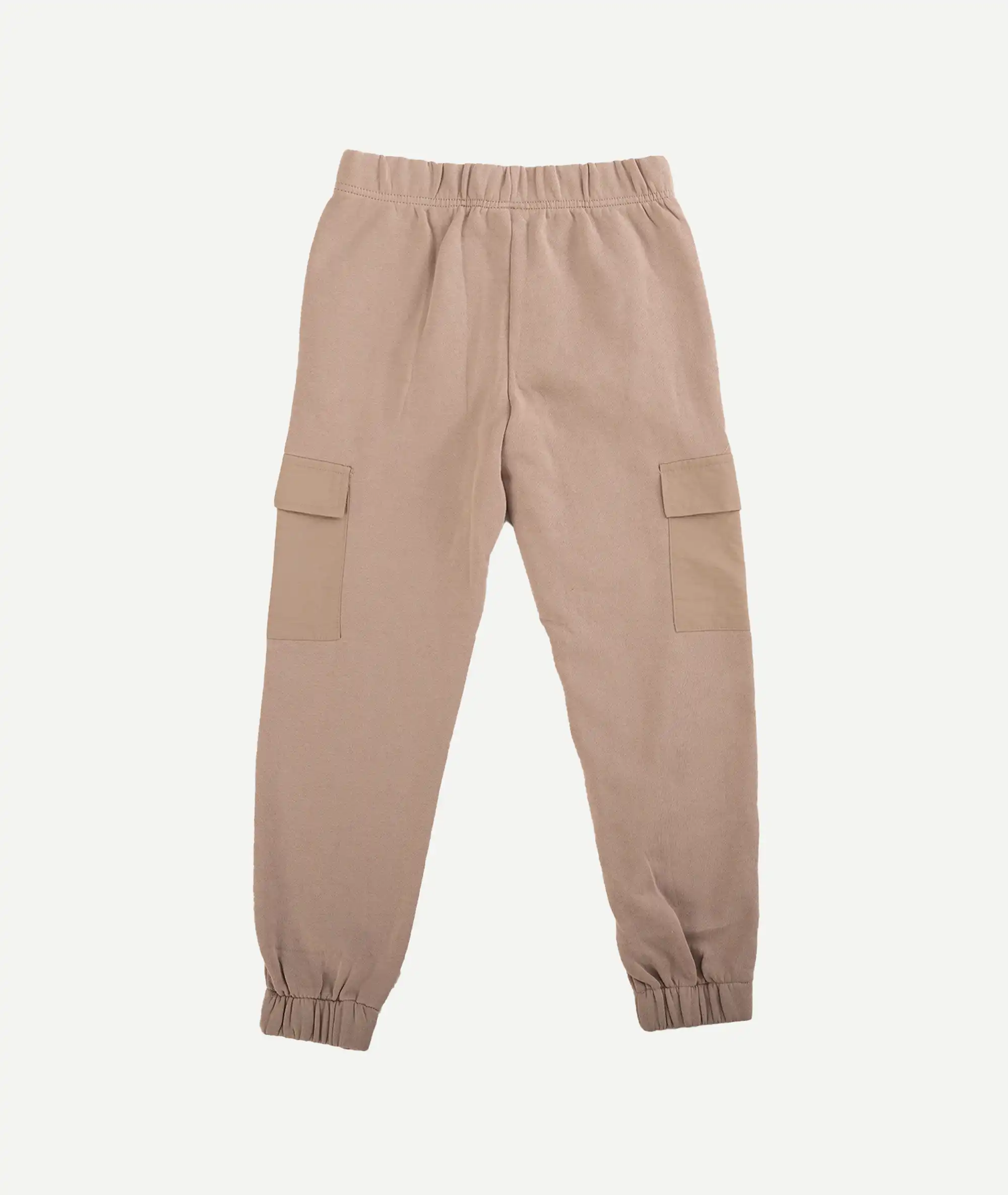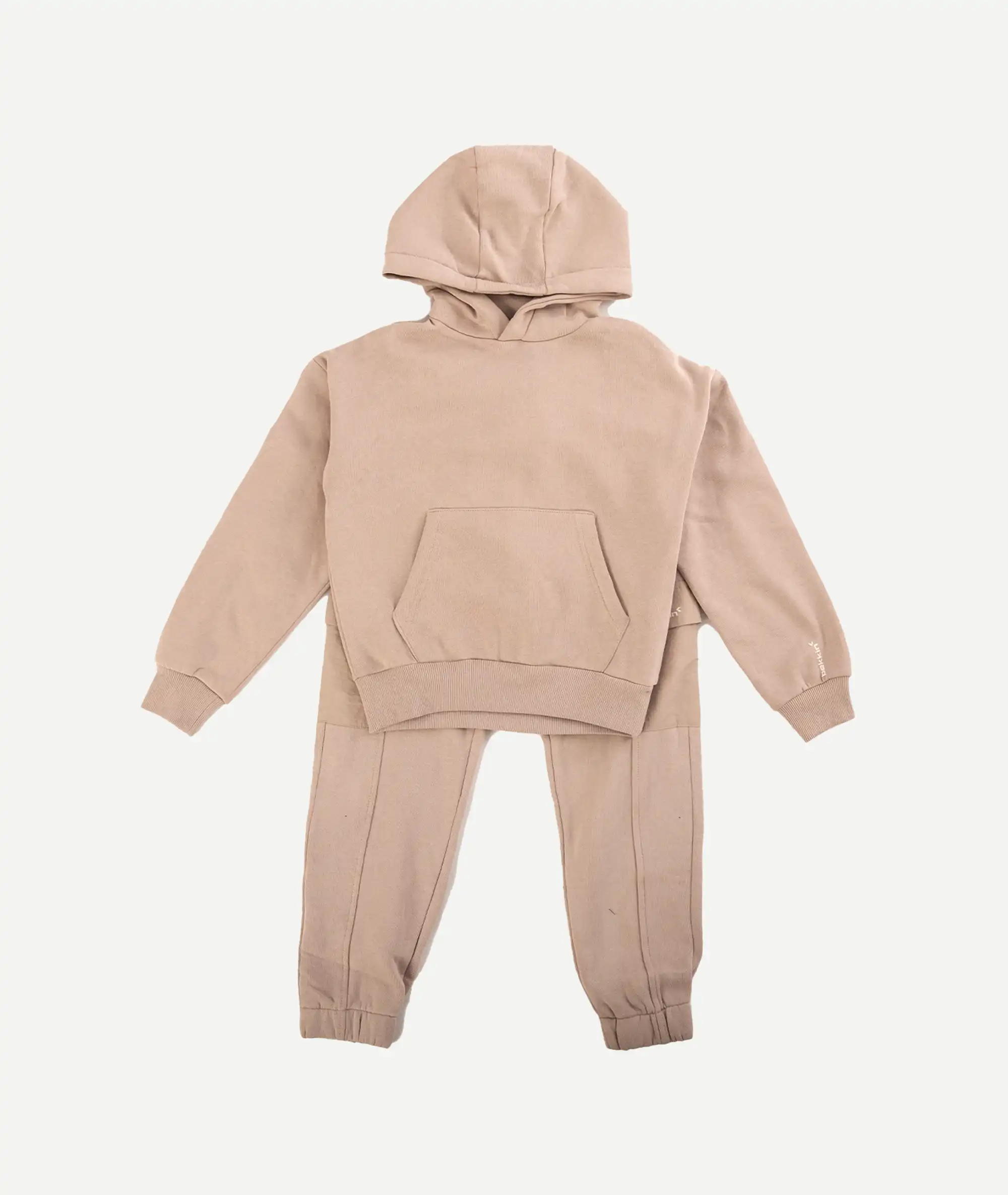 Ensemble jogging BEKKIN en molleton doux, couleur taupe : hoodie à capuche + pantalon cargo taille élastique. Ultra-confort pour le quotidien et la mi-saison.