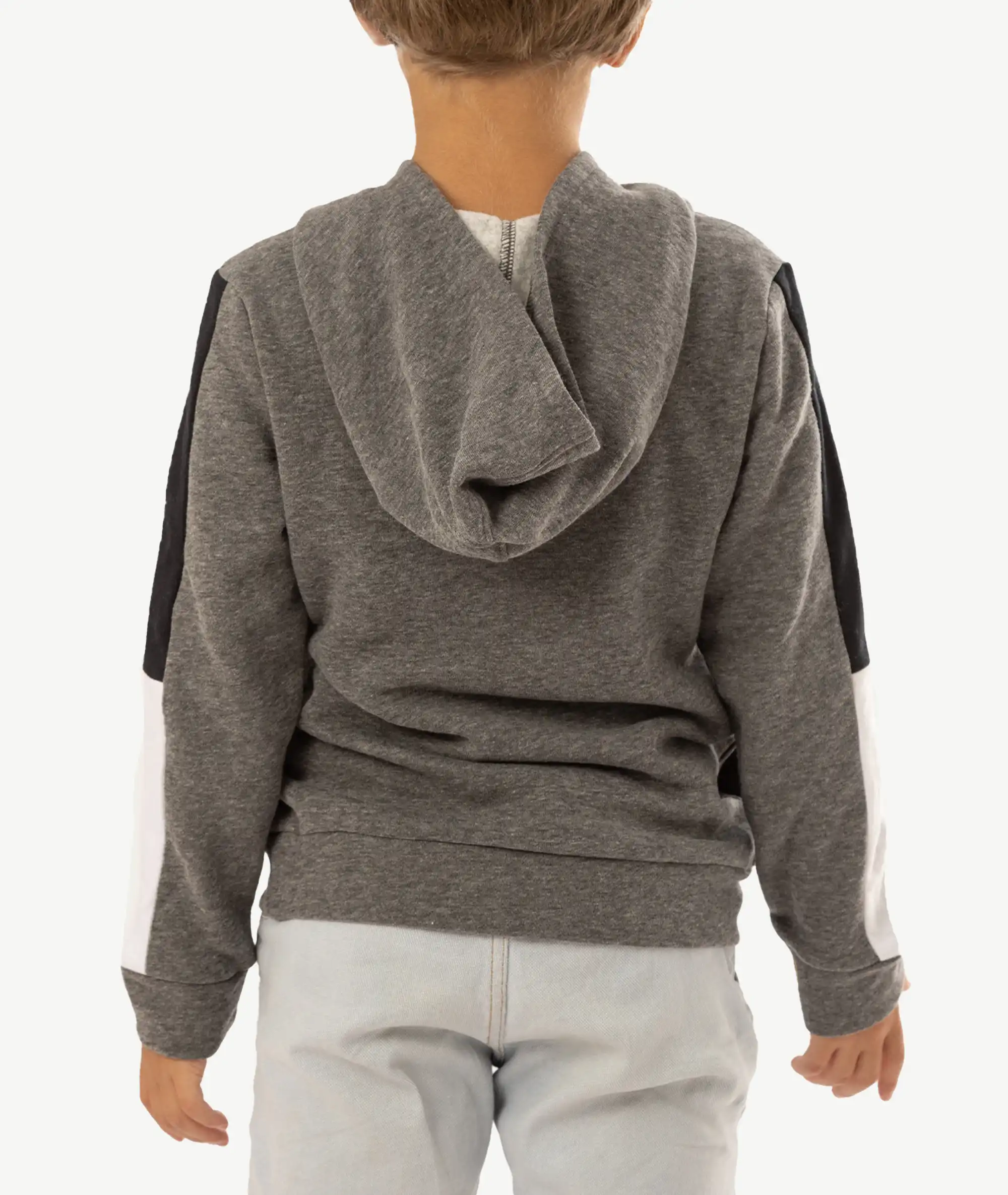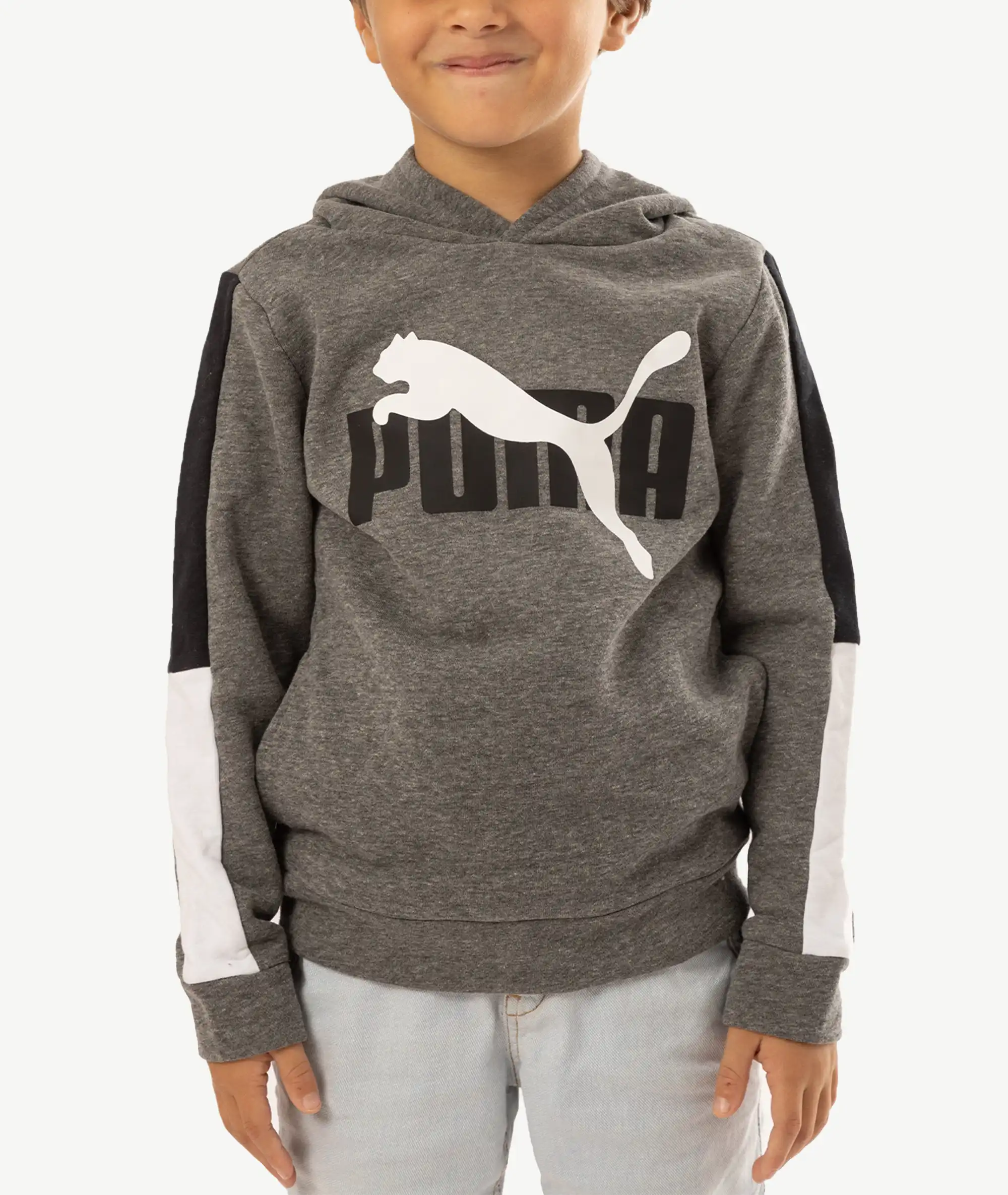Sweat à capuche PUMA pour garçon/fille, gris chiné avec logo félin blanc sur poitrine et bandes contrastées noires & blanches le long des manches. Molleton doux, coupe confort pour l’école et le sport.
