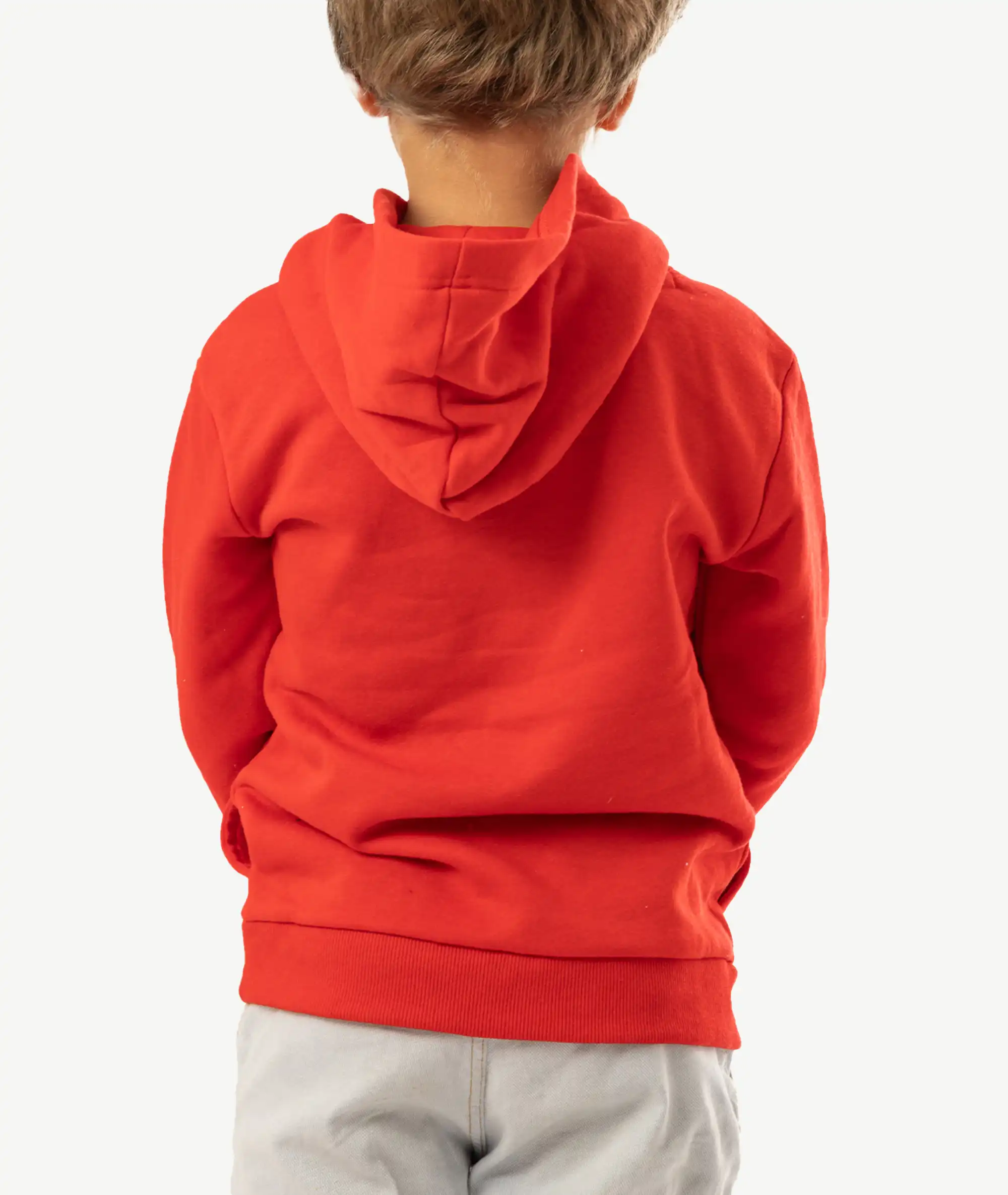 Sweat à capuche PUMA pour enfant, rouge vif, logo félin noir brodé/imprimé sur la poitrine. Molleton doux et chaud, parfait pour l’école et les sorties.