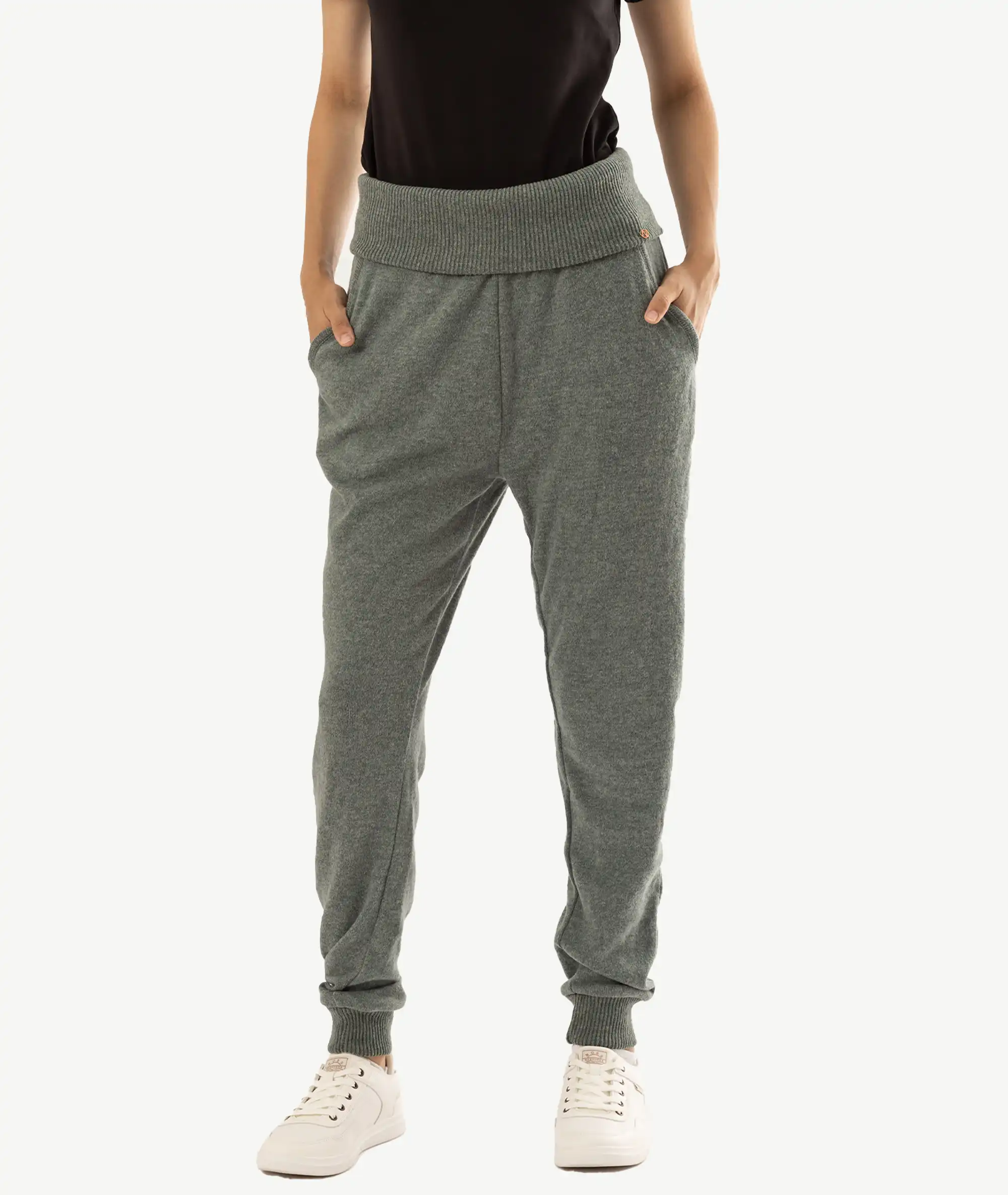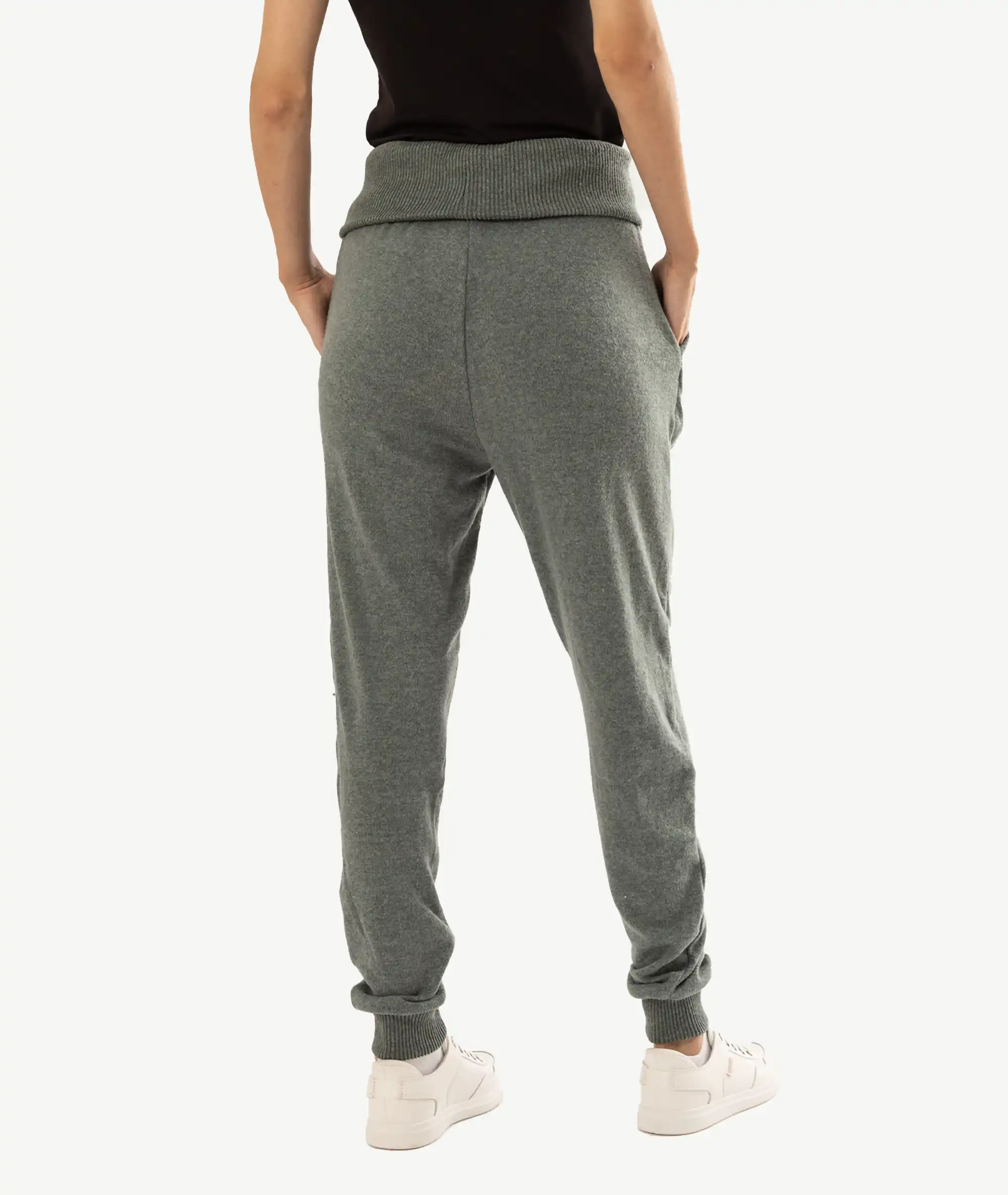 Jogger moelleux en maille douce, Vert anthracite chiné, avec large ceinture repliable en bord-côte pour un maintien ajustable et ultra-confort. Poches latérales, bas de jambe resserrés.