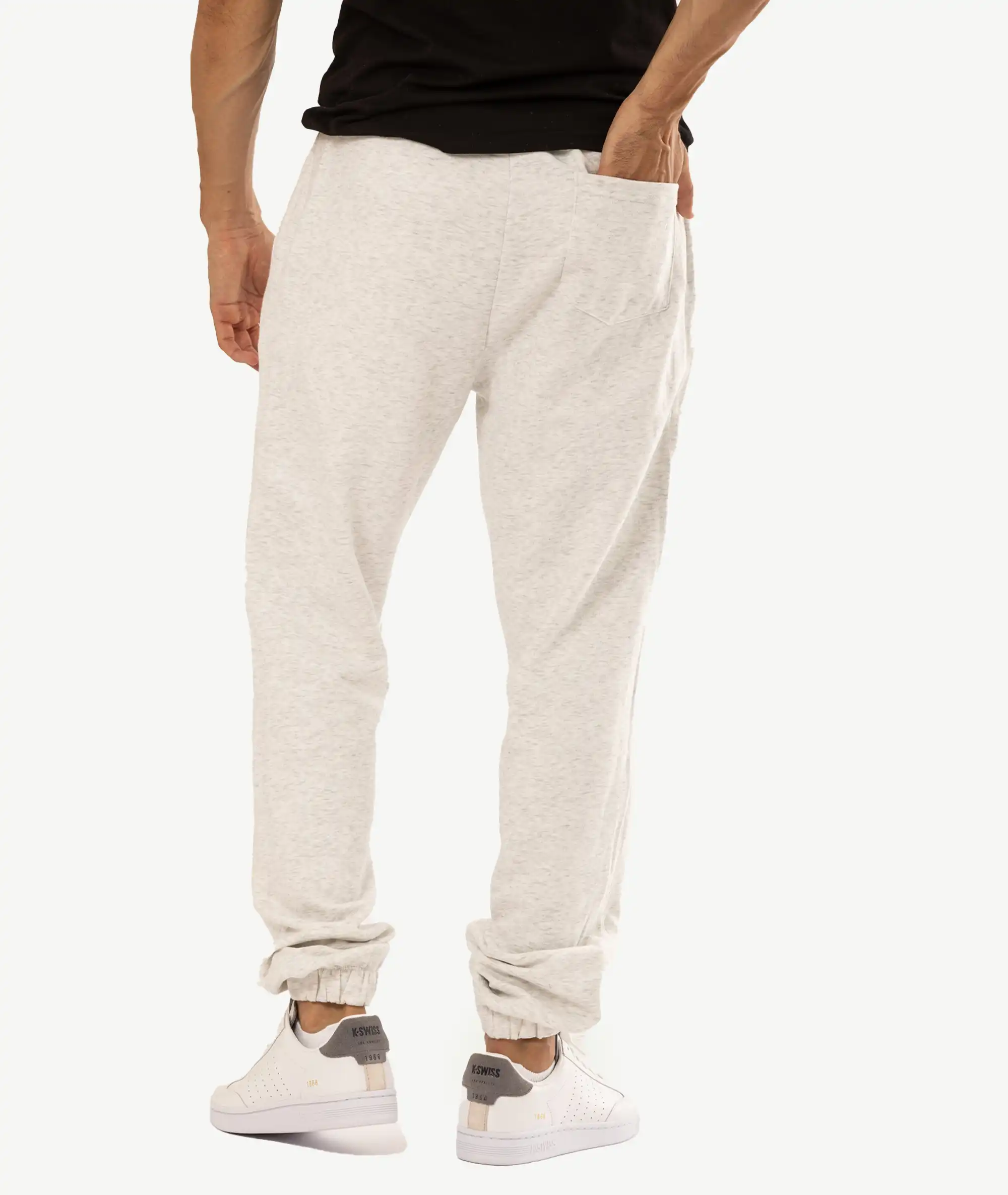 Jogger en molleton doux, couleur gris chiné, coupe fuselée. Taille élastique avec cordon, poches latérales et chevilles resserrées pour un maintien confortable. Parfait pour le quotidien, la maison ou les sorties casual.