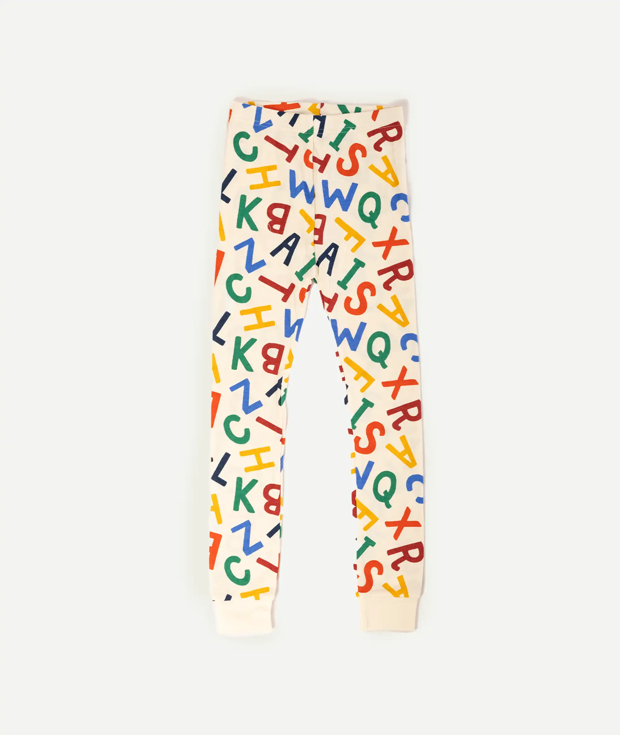 Pyjama ludique et ultra-doux avec imprimé alphabet multicolore sur fond écru. Haut manches longues + pantalon assorti pour des nuits confort… et pleines de lettres !