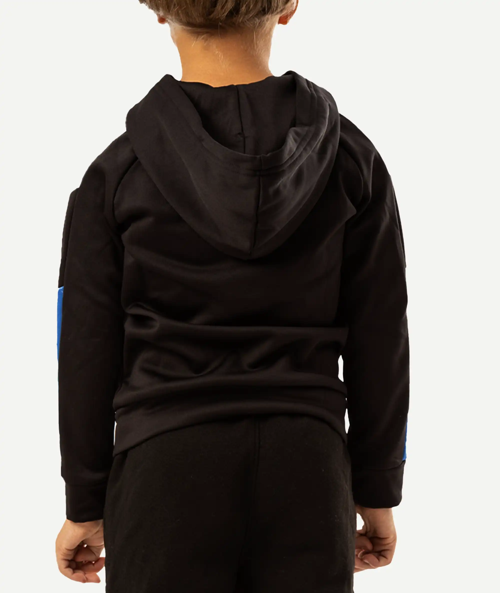 Hoodie zippé PUMA pour enfant, noir avec bandes bleu royal et blanc sur les manches. Molleton doux, idéal pour l’école et le sport.