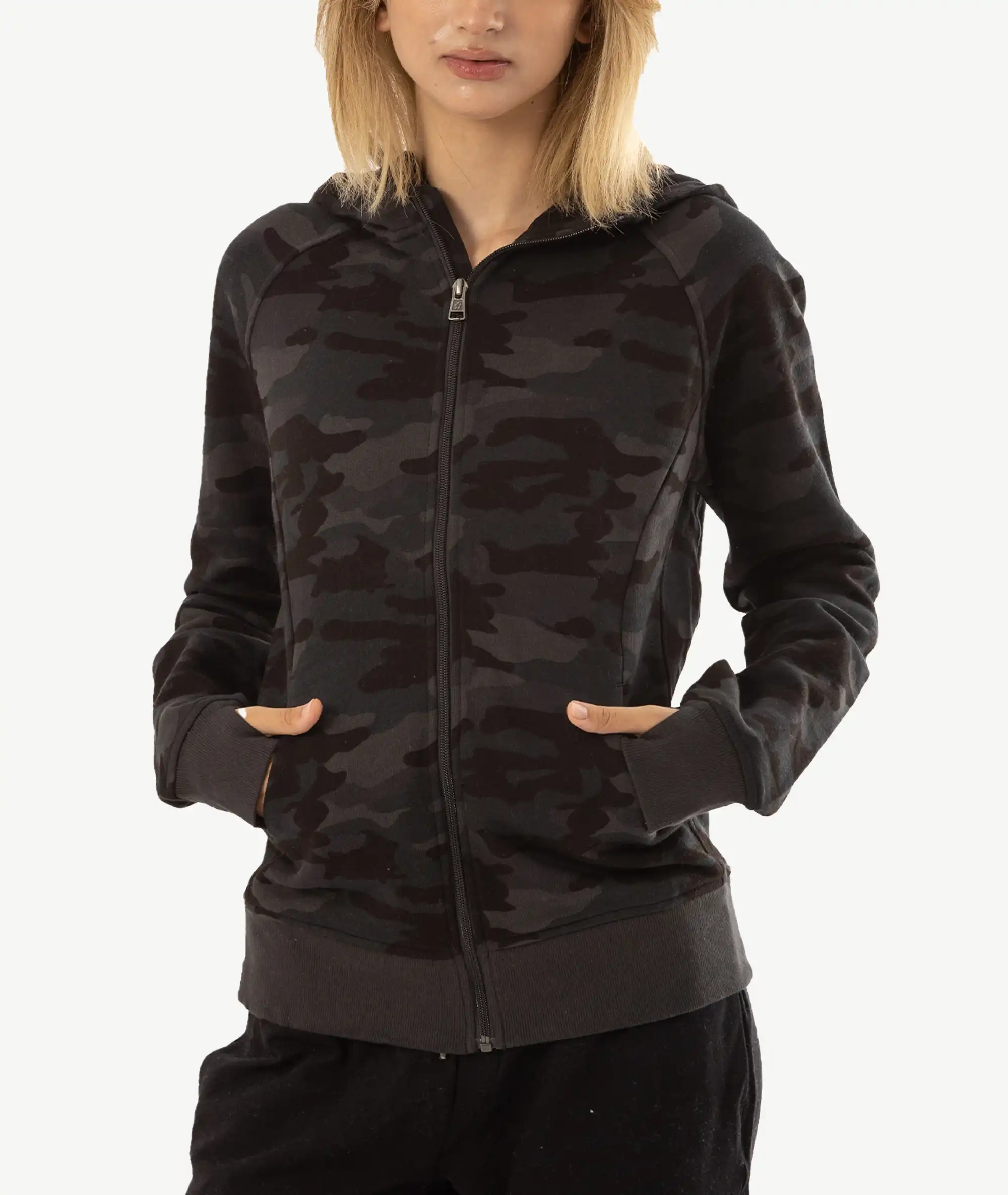 Veste à capuche en molleton doux, imprimé camouflage noir/gris. Coupe regular, zip intégral, 2 poches latérales, bords-côtes aux poignets et à la base. Chaud et polyvalent pour le sport comme le quotidien.